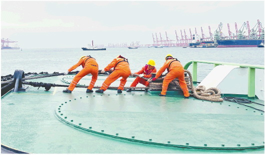 7月27日,在山东港口日照港,工人们正在将拖轮向泊位靠泊。(□记者吴宝书报道)本报济南7月27日讯 今年第6号台风“烟花”走向和影响牵动人心。据气象部门预测,受台风“烟花”影响,我省大部地区将出现暴雨局部大暴雨或特大暴雨。# …[详细]