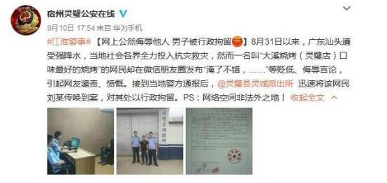 昨日,安徽省宿州市灵璧县公安局官方微博发布通报称,近期广东汕头遭受强降水,一名网民在微信朋友圈发布“淹了不错,……”等贬低、侮辱言论,被处以行政拘留。