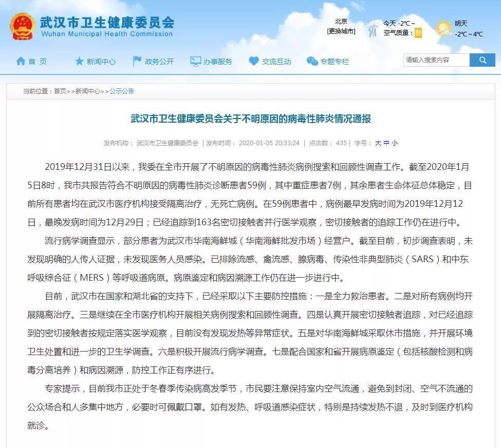1月5日,武汉市卫健委发布关于不明原因的病毒性肺炎情况通报。全文如下:2019年12月31日以来,我委在全市开展了不明原因的病毒性肺炎病例搜索和 ...…[详细]