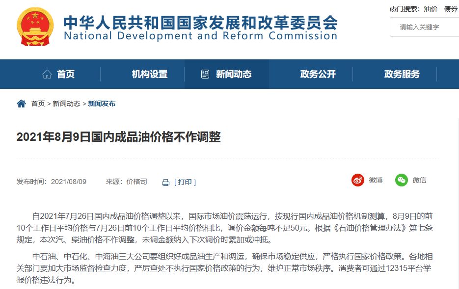 央视网消息:据国家发改委网站消息,自2021年7月26日国内成品油价格调整以来,国际市场油价震荡运行,按现行国内成品油价格机制测算,8月9日的前10个工作日平均价格与7月26日前10个工作日平均价格相比,调价金额每吨不足50元。根据《石油价格管理办法》第...…[详细]