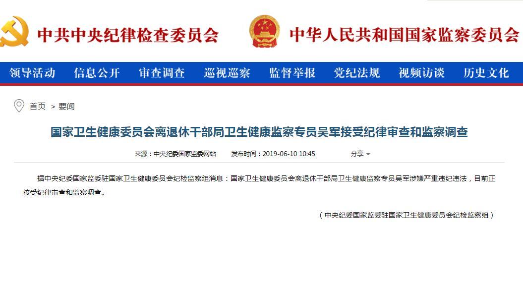 据中央纪委国家监委驻国家卫生健康委员会纪检监察组消息:国家卫生健康委员会离退休干部局卫生健康监察专员吴军涉嫌严重违纪违法,目前正接受纪律审查和监察调查。...…[详细]