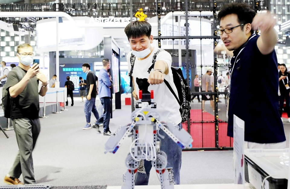 7月8日,2021世界人工智能大会在上海开幕。这是参观者(中)在展会现场体验体感机器人玩具。 (新华社发) 一年一度的世界人工智能大会,向来被全球AI行业视为风向标。今年的盛会上,又有哪些值得关注的“ ...…[详细]